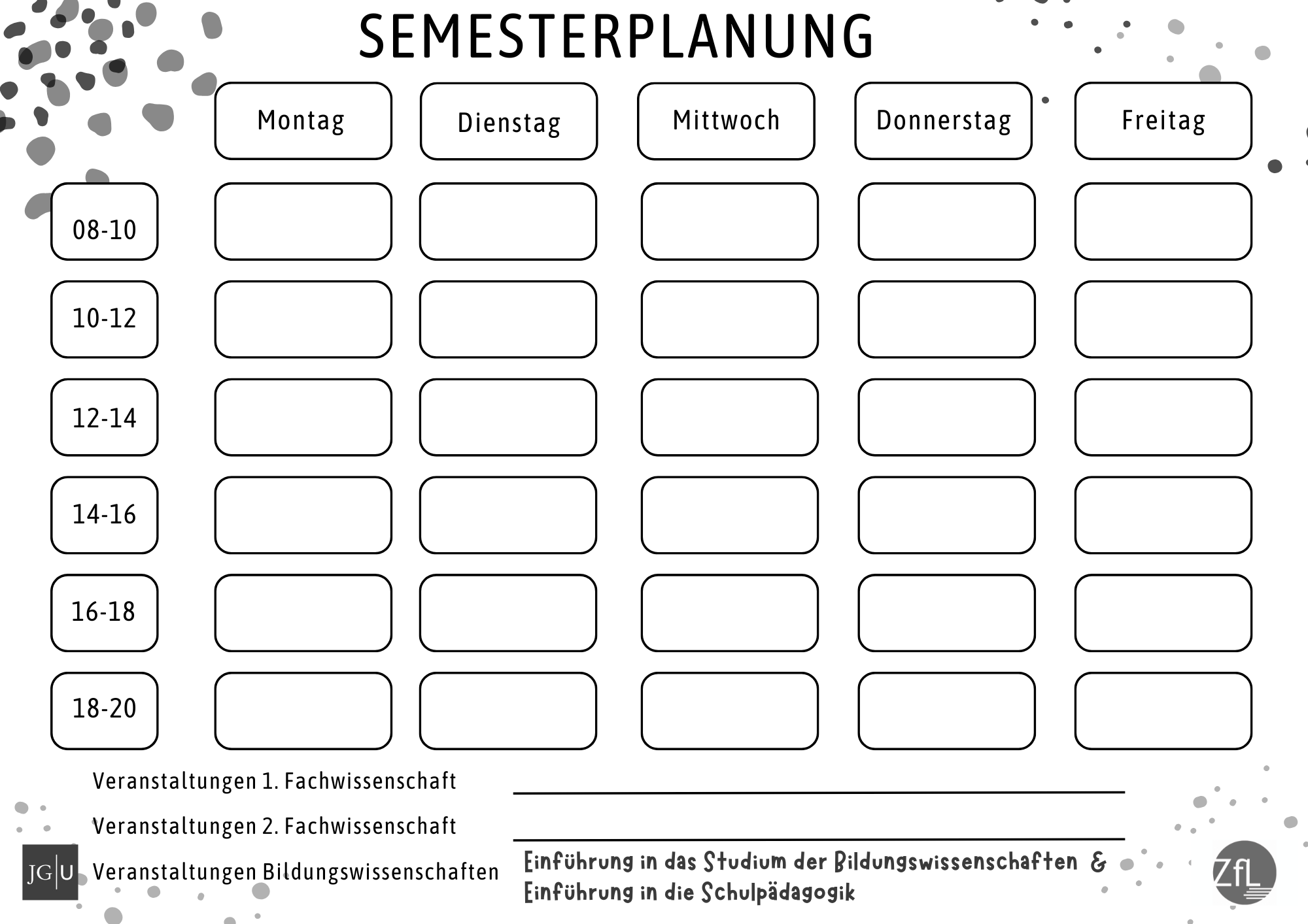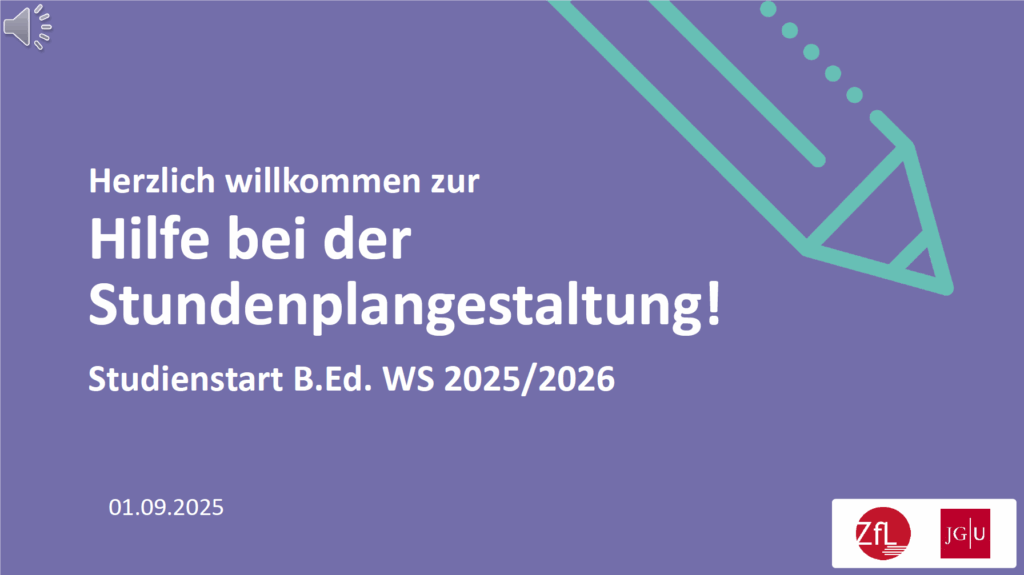 In der Einführungswoche vor Vorlesungsbeginn (20.-24.10.2025) bietet das Zentrum für Lehrerbildung Erstsemesterstudierenden Hilfe bei der Stundenplangestaltung an. An vier Terminen unterstützen wir und unsere erfahrenen Tutor/innen Studienanfänger/innen im B.Ed. bei der Erstellung ihres Stundenplans und geben Tipps zur Veranstaltungsanmeldung in JOGU-StINe.