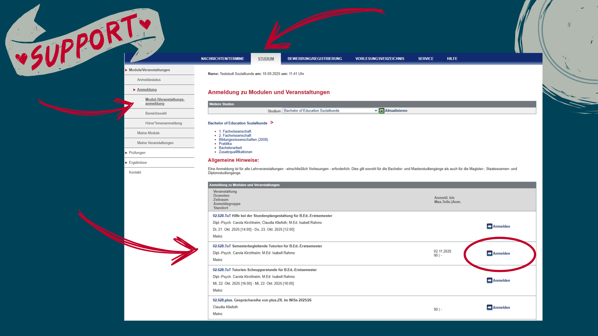 Die Tutorien starten dann Anfang November; die Kurszeiten finden Sie hier. Bitte beachten Sie, dass für die Tutorien eine Anmeldung erforderlich ist. Diese erfolgt über JOGU-StINe und ist vom 20.10.2025, 13 Uhr bis zum 02.11.2025, 18 Uhr möglich. Es gilt das Prinzip "first come, first served" - d.h. Sie können sich sofort einen Platz im von Ihnen gewünschten Kurs buchen.
